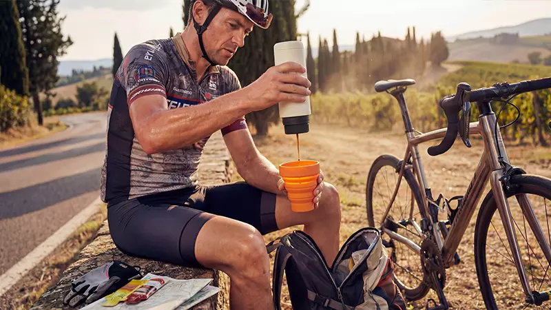 "Post-ride fuel or post-hike chill — hot espresso to power up, iced coffee to cool down"